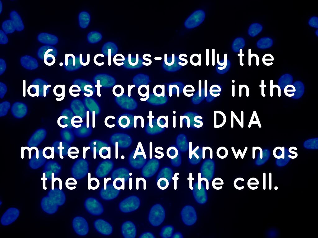 6.nucleus-usally the largest organelle in the cell contains DNA material. Also known as the brain of the cell.