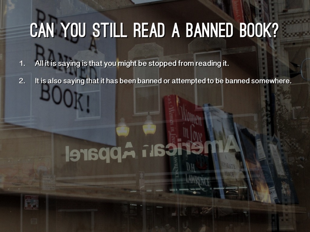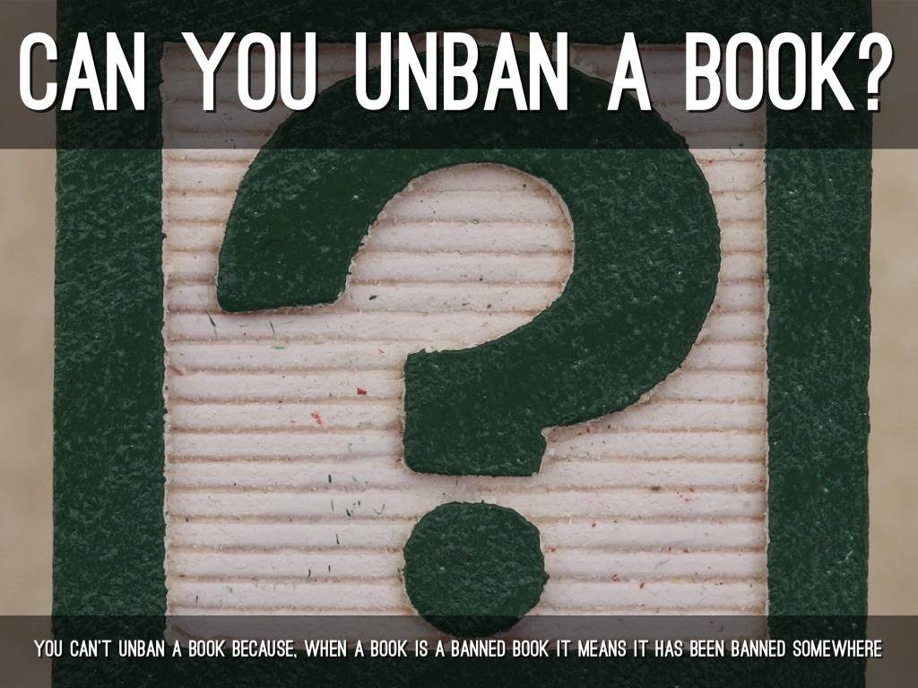 YOU CAN'T UNBAN A BOOK BECAUSE, WHEN A BOOK IS A BANNED BOOK IT MEANS IT HAS BEEN BANNED SOMEWHERE