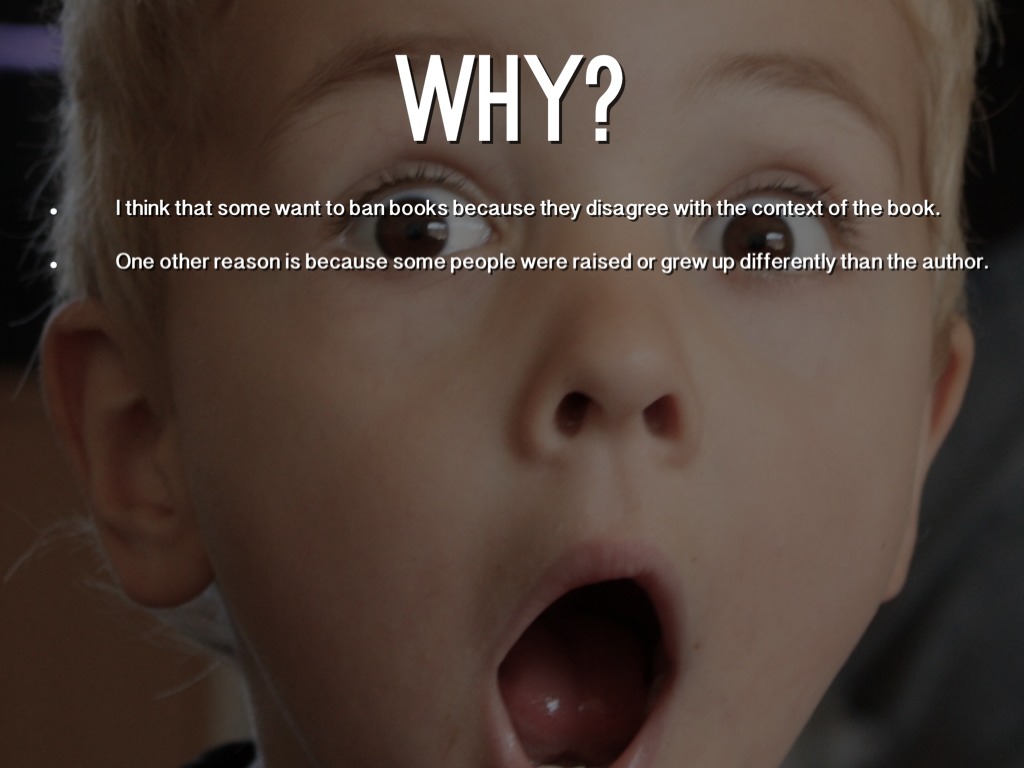 BANNING BOOKS IS THE FIRST THING DONE WHEN SOMEONE DOESN'T LIKE OR UNDERSTAND THE TEXT IN A BOOK.