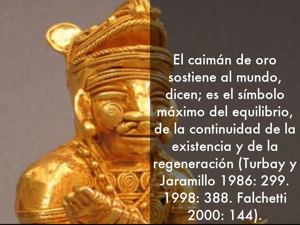 El caimán de oro sostiene al mundo, dicen; es el símbolo máximo del equilibrio, de la continuidad de la existencia y de la regeneración (Turbay y Jaramillo 1986: 299. 1998: 388. Falchetti 2000: 144).