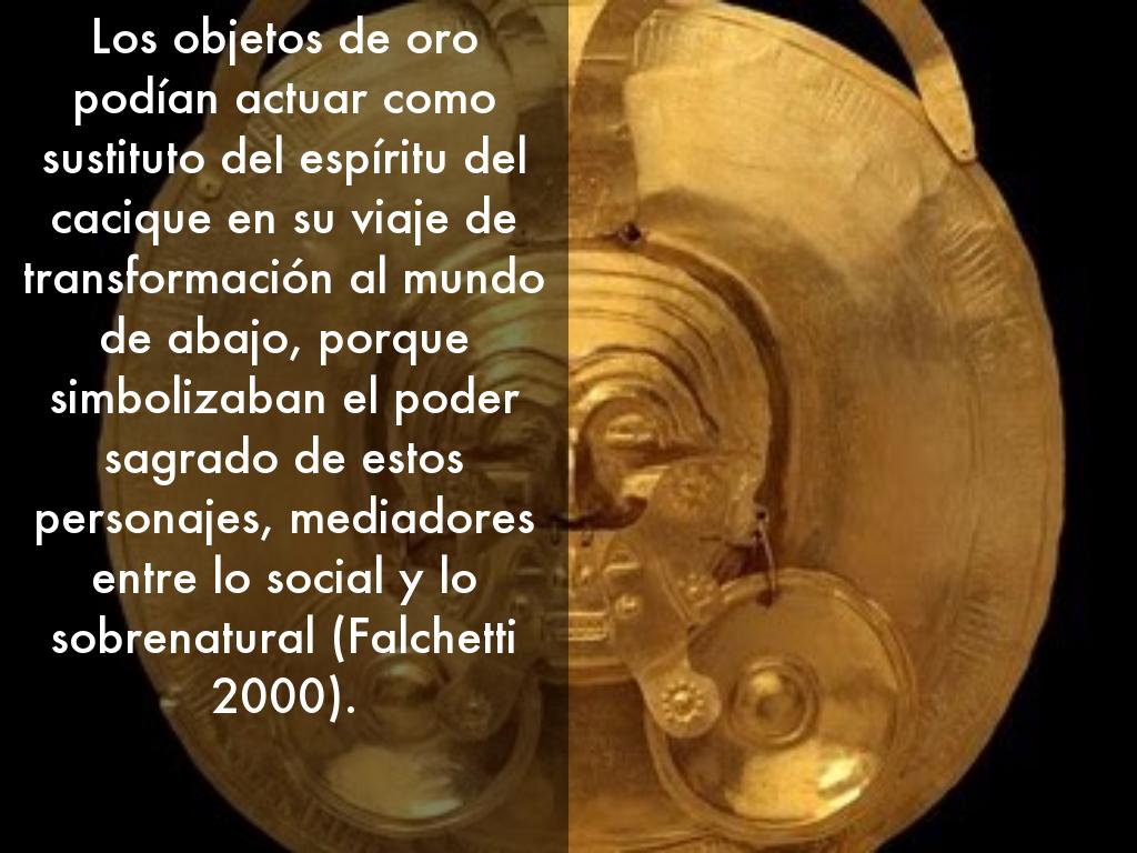 Los objetos de oro podían actuar como sustituto del espíritu del cacique en su viaje de transformación al mundo de abajo, porque simbolizaban el poder sagrado de estos personajes, mediadores entre lo social y lo sobrenatural (Falchetti 2000).