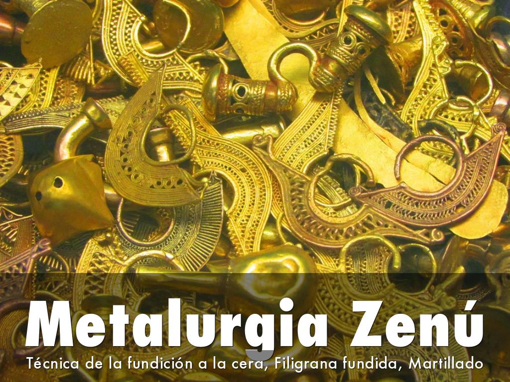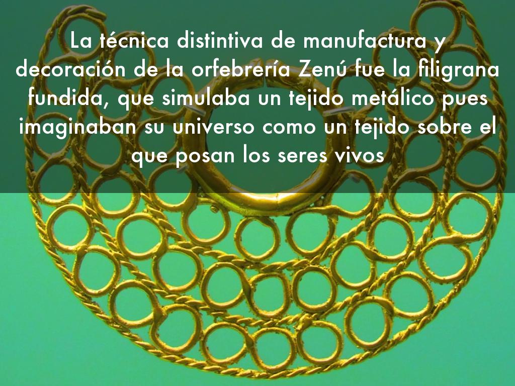 La técnica distintiva de manufactura y decoración de la orfebrería Zenú fue la filigrana fundida, que simulaba un tejido metálico pues imaginaban su universo como un tejido sobre el que posan los seres vivos