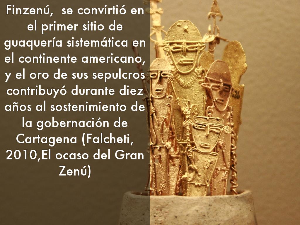 Finzenú, se convirtió en el primer sitio de guaquería sistemática en el continente americano, y el oro de sus sepulcros contribuyó durante diez años al sostenimiento de la gobernación de Cartagena (Falcheti, 2010,El ocaso del Gran Zenú)
