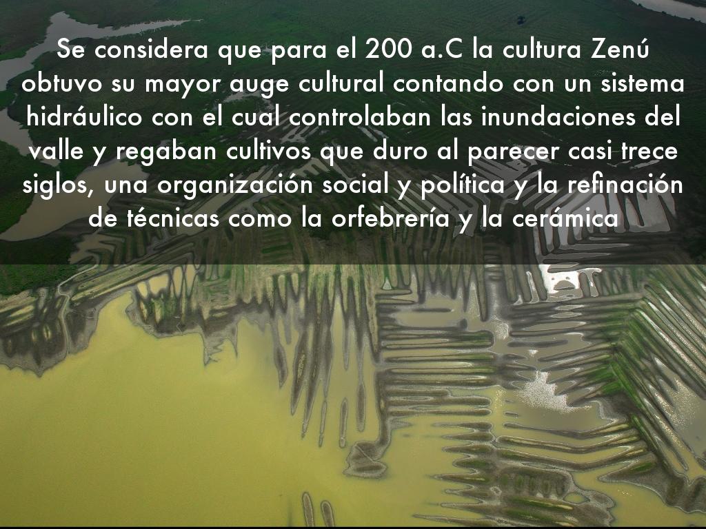 Se considera que para el 200 a.C la cultura Zenú obtuvo su mayor auge cultural contando con un sistema hidráulico con el cual controlaban las inundaciones del valle y regaban cultivos que duro al parecer casi trece siglos, una organización social y política y la refinación de técnicas como la orfebrería y la cerámica