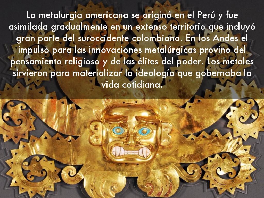 La metalurgia americana se originó en el Perú y fue asimilada gradualmente en un extenso territorio que incluyó gran parte del suroccidente colombiano. En los Andes el impulso para las innovaciones metalúrgicas provino del pensamiento religioso y de las élites del poder. Los metales sirvieron para materializar la ideología que gobernaba la vida cotidiana.
