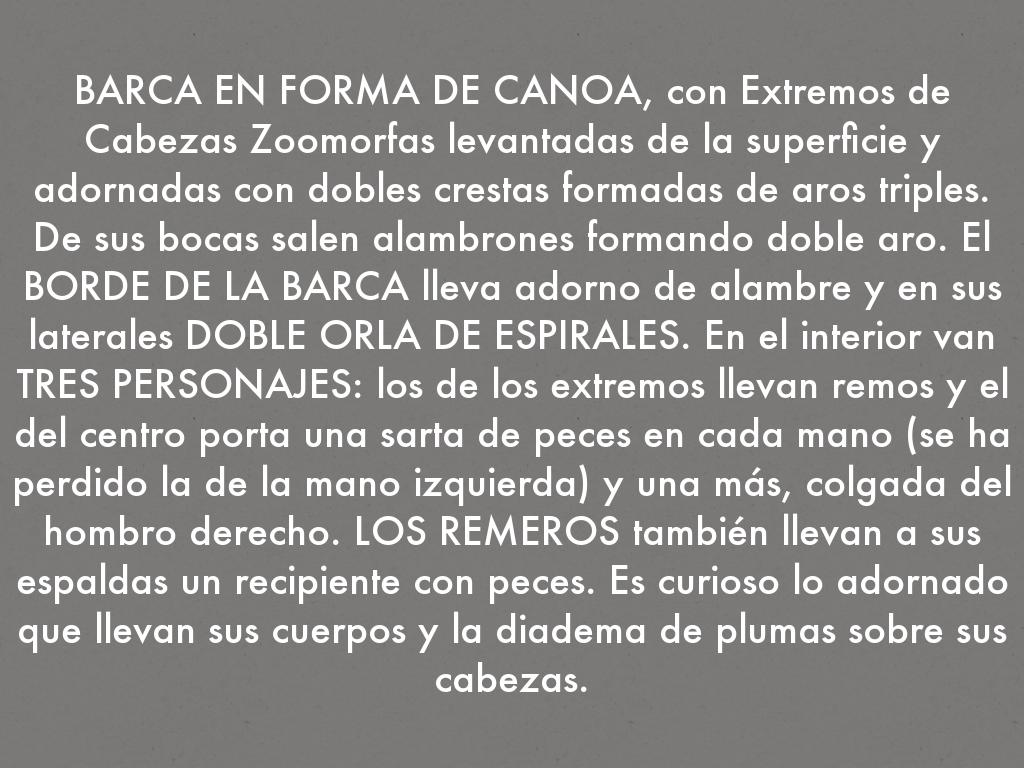 BARCA EN FORMA DE CANOA, con Extremos de Cabezas Zoomorfas levantadas de la superficie y adornadas con dobles crestas formadas de aros triples. De sus bocas salen alambrones formando doble aro. El BORDE DE LA BARCA lleva adorno de alambre y en sus laterales DOBLE ORLA DE ESPIRALES. En el interior van TRES PERSONAJES: los de los extremos llevan remos y el del centro porta una sarta de peces en cada mano (se ha perdido la de la mano izquierda) y una más, colgada del hombro derecho. LOS REMEROS también llevan a sus espaldas un recipiente con peces. Es curioso lo adornado que llevan sus cuerpos y la diadema de plumas sobre sus cabezas.