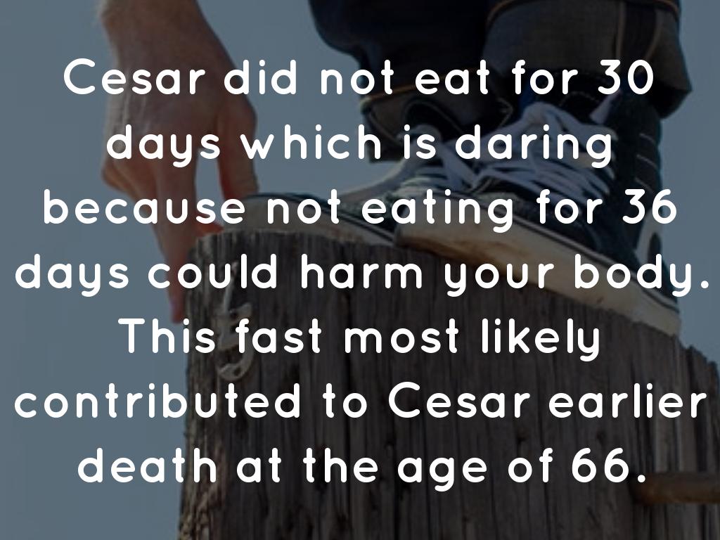 Cesar did not eat for 30 days which is daring because not eating for 36 days could harm your body. This fast most likely contributed to Cesar earlier death at the age of 66.