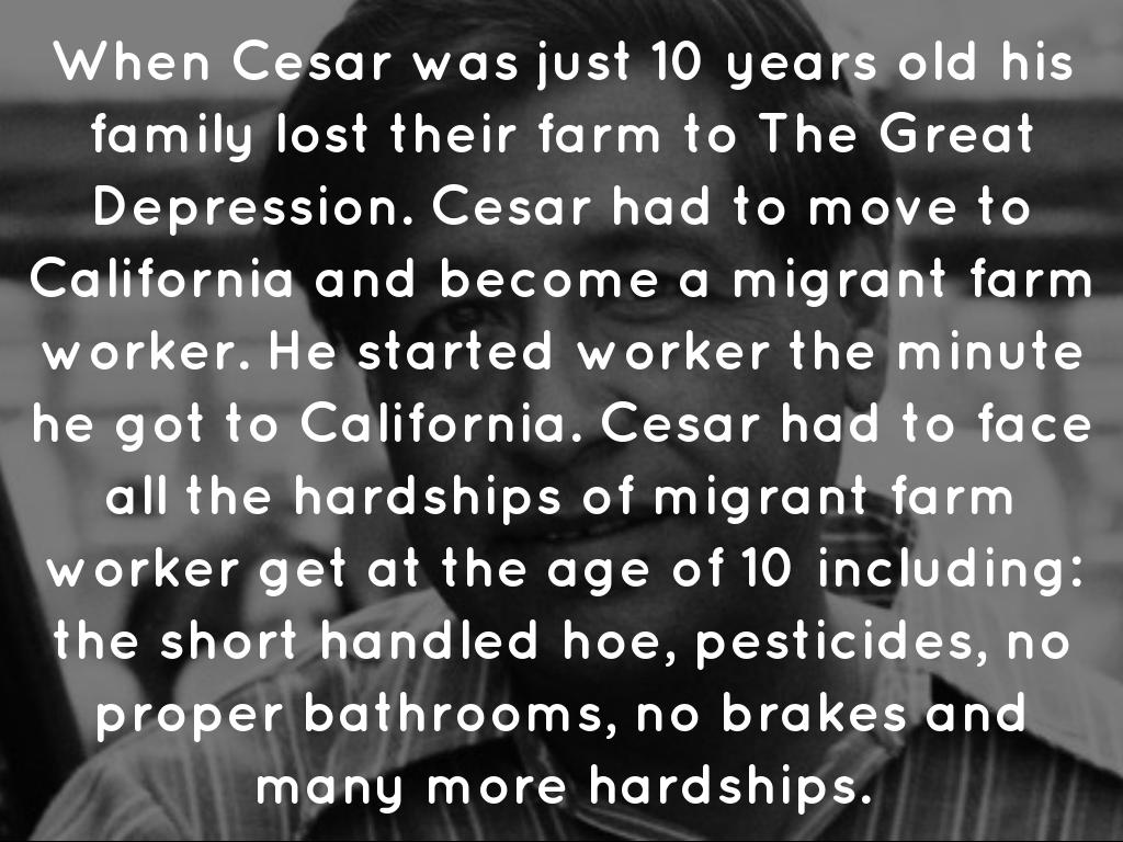 When Cesar was just 10 years old his family lost their farm to The Great Depression. Cesar had to move to California and become a migrant farm worker. He started worker the minute he got to California. Cesar had to face all the hardships of migrant farm worker get at the age of 10 including: the short handled hoe, pesticides, no proper bathrooms, no brakes and many more hardships.