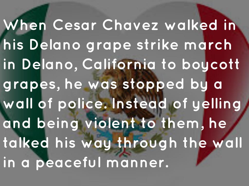 When Cesar Chavez walked in his Delano grape strike march in Delano, California to boycott grapes, he was stopped by a wall of police. Instead of yelling and being violent to them, he talked his way through the wall in a peaceful manner.