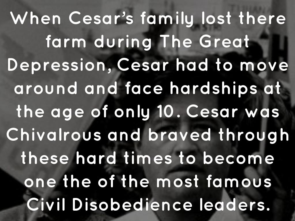When Cesar’s family lost there farm during The Great Depression, Cesar had to move around and face hardships at the age of only 10. Cesar was Chivalrous and braved through these hard times to become one the of the most famous Civil Disobedience leaders.
