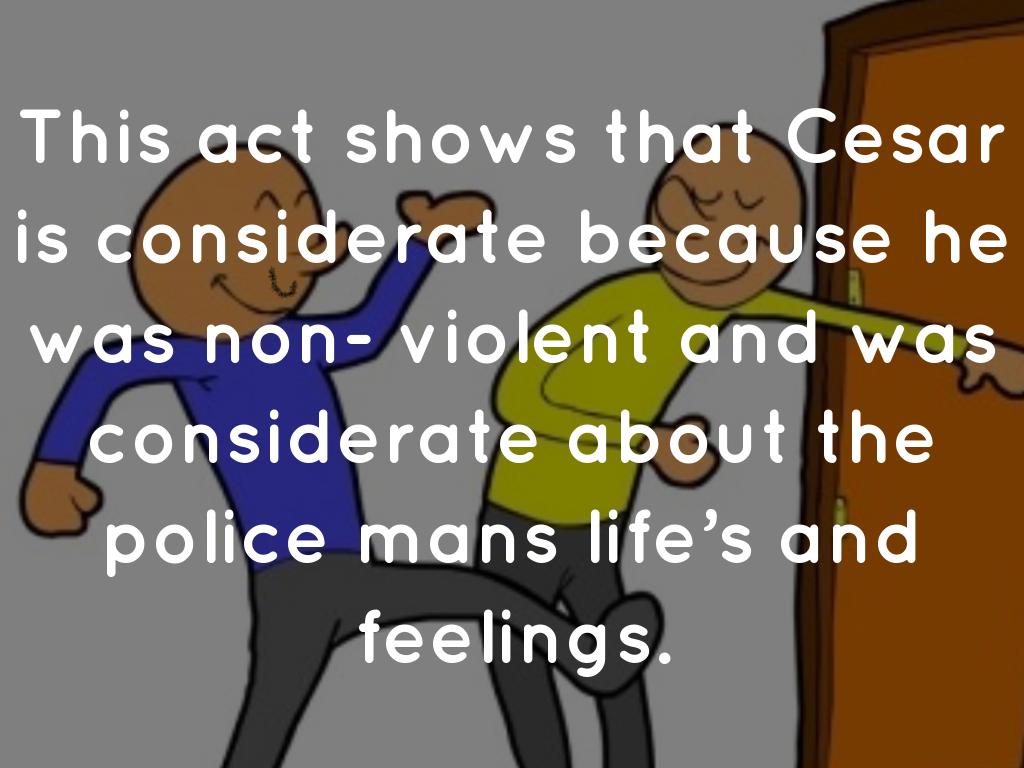 This act shows that Cesar is considerate because he was non- violent and was considerate about the police mans life’s and feelings.
