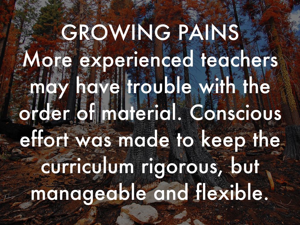GROWING PAINS More experienced teachers may have trouble with the order of material. Conscious effort was made to keep the curriculum rigorous, but manageable and flexible.