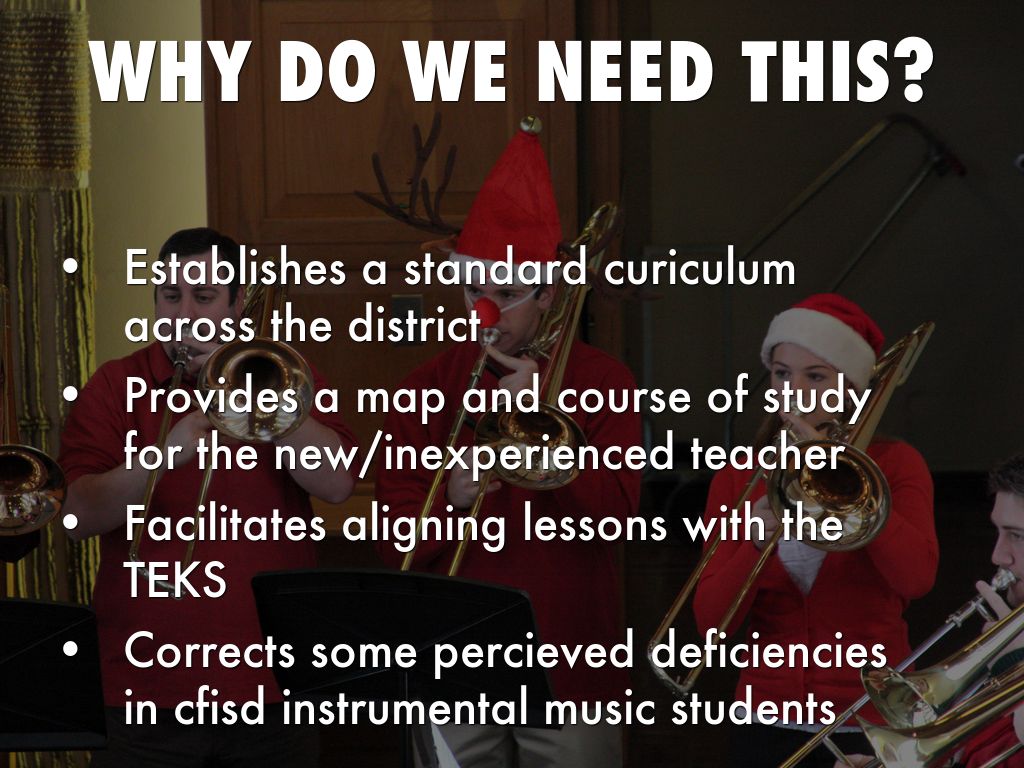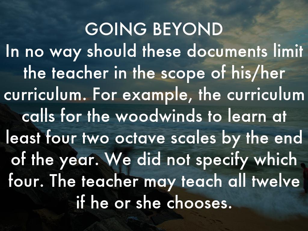 GOING BEYOND In no way should these documents limit the teacher in the scope of his/her curriculum. For example, the curriculum calls for the woodwinds to learn at least four two octave scales by the end of the year. We did not specify which four. The teacher may teach all twelve if he or she chooses.
