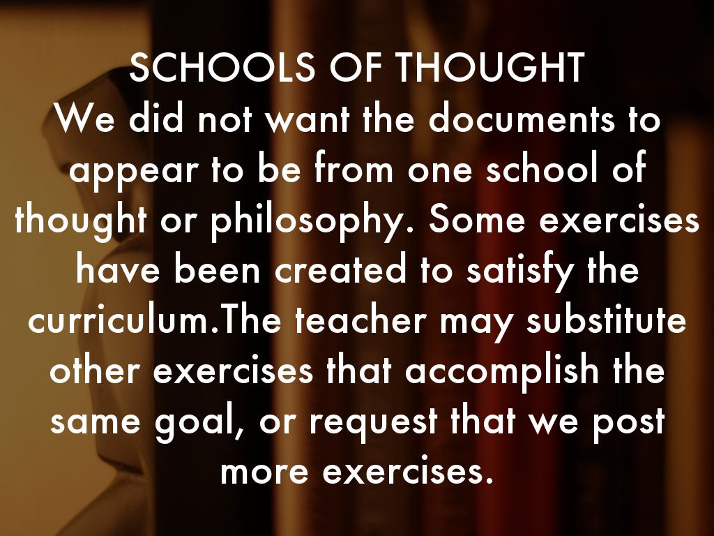 SCHOOLS OF THOUGHT We did not want the documents to appear to be from one school of thought or philosophy. Some exercises have been created to satisfy the curriculum.The teacher may substitute other exercises that accomplish the same goal, or request that we post more exercises.