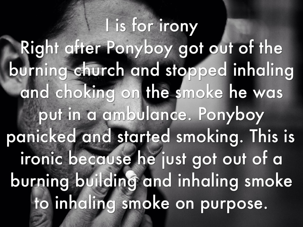 I is for irony Right after Ponyboy got out of the burning church and stopped inhaling and choking on the smoke he was put in a ambulance. Ponyboy panicked and started smoking. This is ironic because he just got out of a burning building and inhaling smoke to inhaling smoke on purpose.