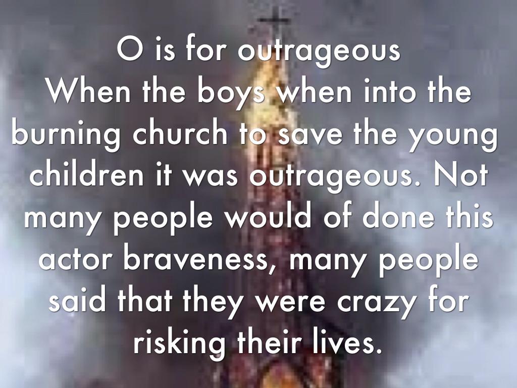 O is for outrageous When the boys when into the burning church to save the young children it was outrageous. Not many people would of done this actor braveness, many people said that they were crazy for risking their lives.