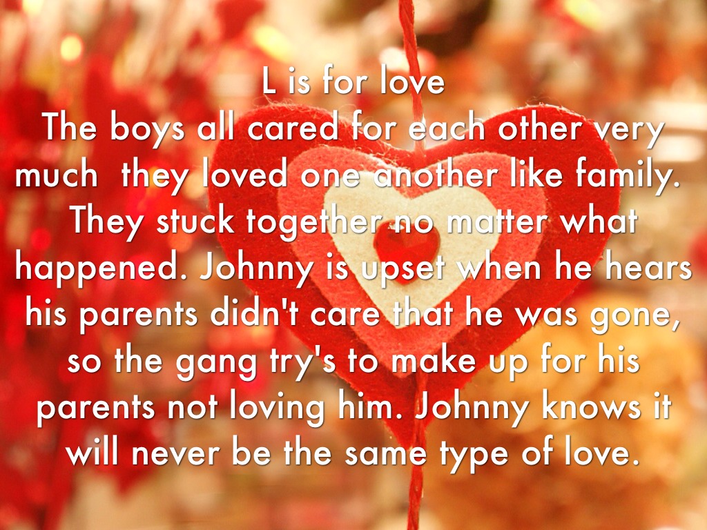 L is for love The boys all cared for each other very much they loved one another like family. They stuck together no matter what happened. Johnny is upset when he hears his parents didn't care that he was gone, so the gang try's to make up for his parents not loving him. Johnny knows it will never be the same type of love.
