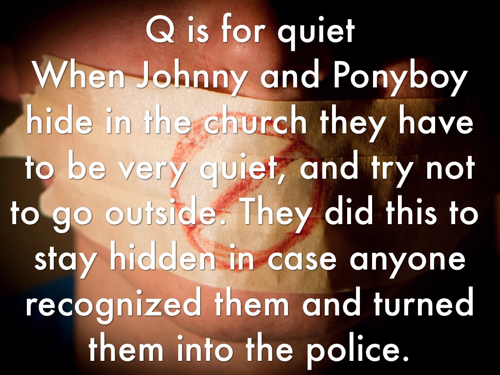 Q is for quiet When Johnny and Ponyboy hide in the church they have to be very quiet, and try not to go outside. They did this to stay hidden in case anyone recognized them and turned them into the police.