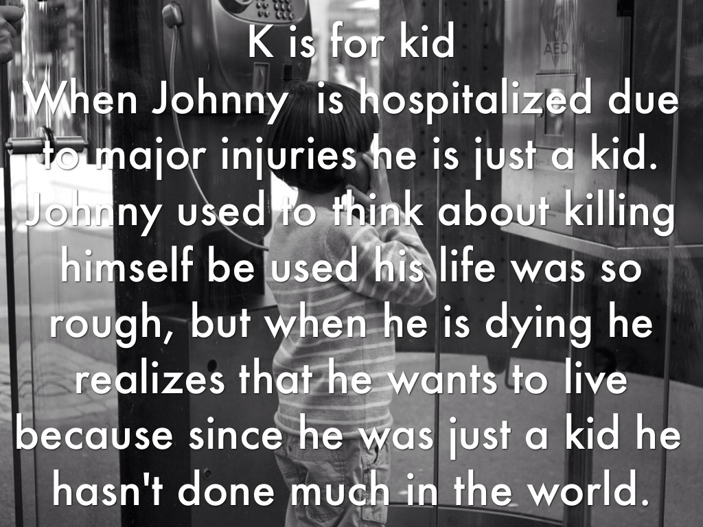 K is for kid When Johnny is hospitalized due to major injuries he is just a kid. Johnny used to think about killing himself be used his life was so rough, but when he is dying he realizes that he wants to live because since he was just a kid he hasn't done much in the world.