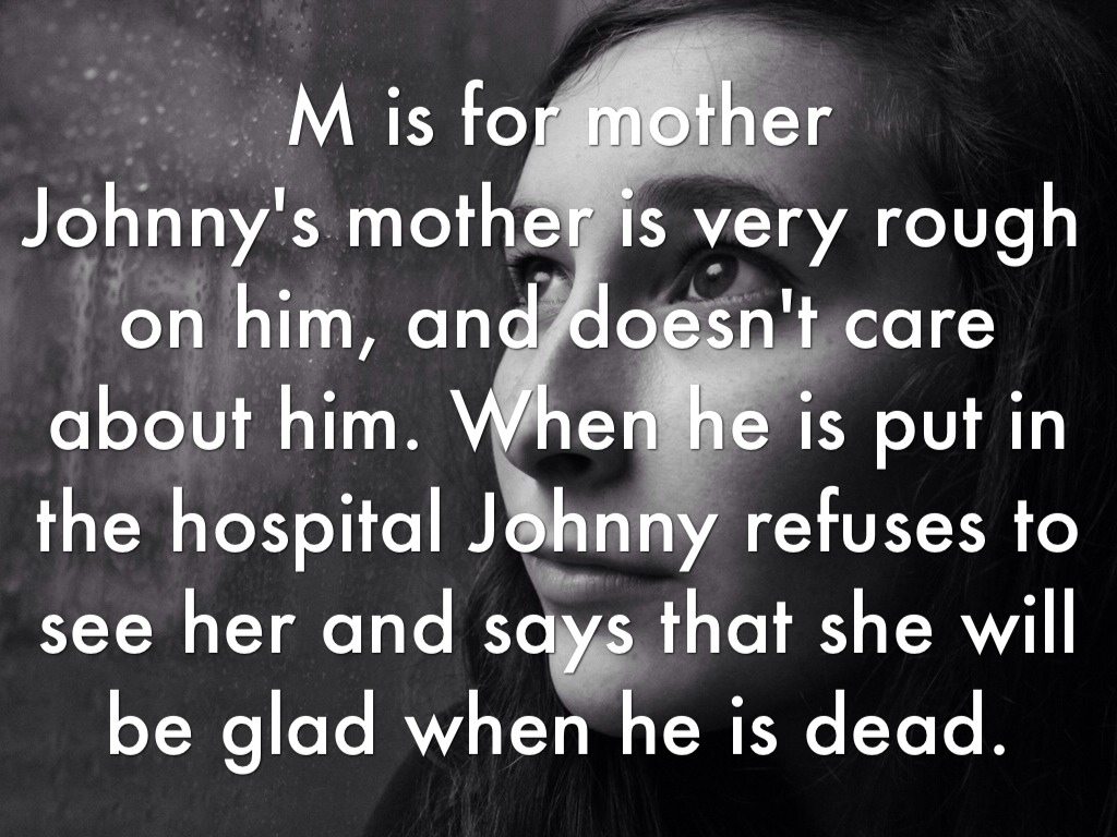M is for mother Johnny's mother is very rough on him, and doesn't care about him. When he is put in the hospital Johnny refuses to see her and says that she will be glad when he is dead.