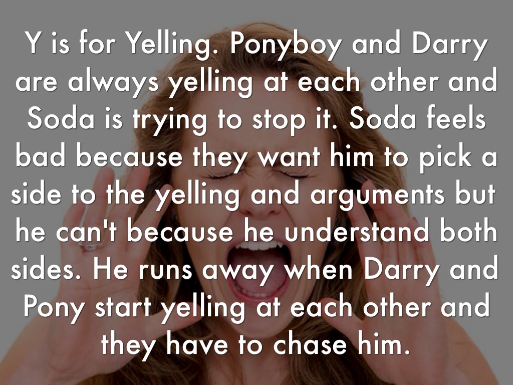 Y is for Yelling. Ponyboy and Darry are always yelling at each other and Soda is trying to stop it. Soda feels bad because they want him to pick a side to the yelling and arguments but he can't because he understand both sides. He runs away when Darry and Pony start yelling at each other and they have to chase him.