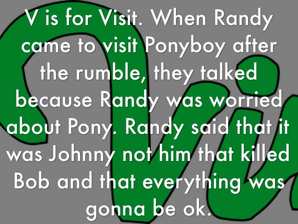 V is for Visit. When Randy came to visit Ponyboy after the rumble, they talked because Randy was worried about Pony. Randy said that it was Johnny not him that killed Bob and that everything was gonna be ok.