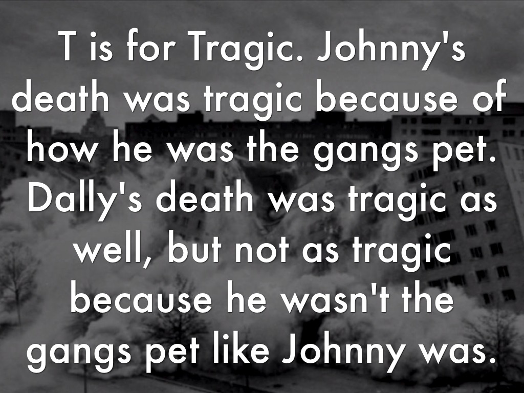 T is for Tragic. Johnny's death was tragic because of how he was the gangs pet. Dally's death was tragic as well, but not as tragic because he wasn't the gangs pet like Johnny was.