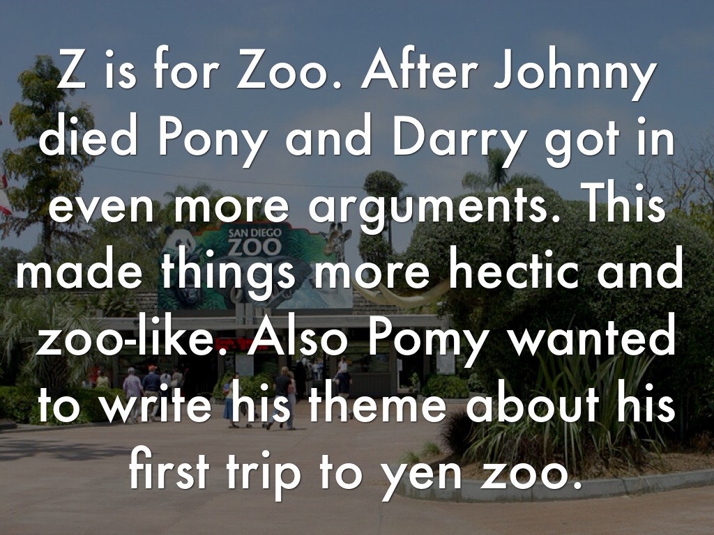 Z is for Zoo. After Johnny died Pony and Darry got in even more arguments. This made things more hectic and zoo-like. Also Pomy wanted to write his theme about his first trip to yen zoo.