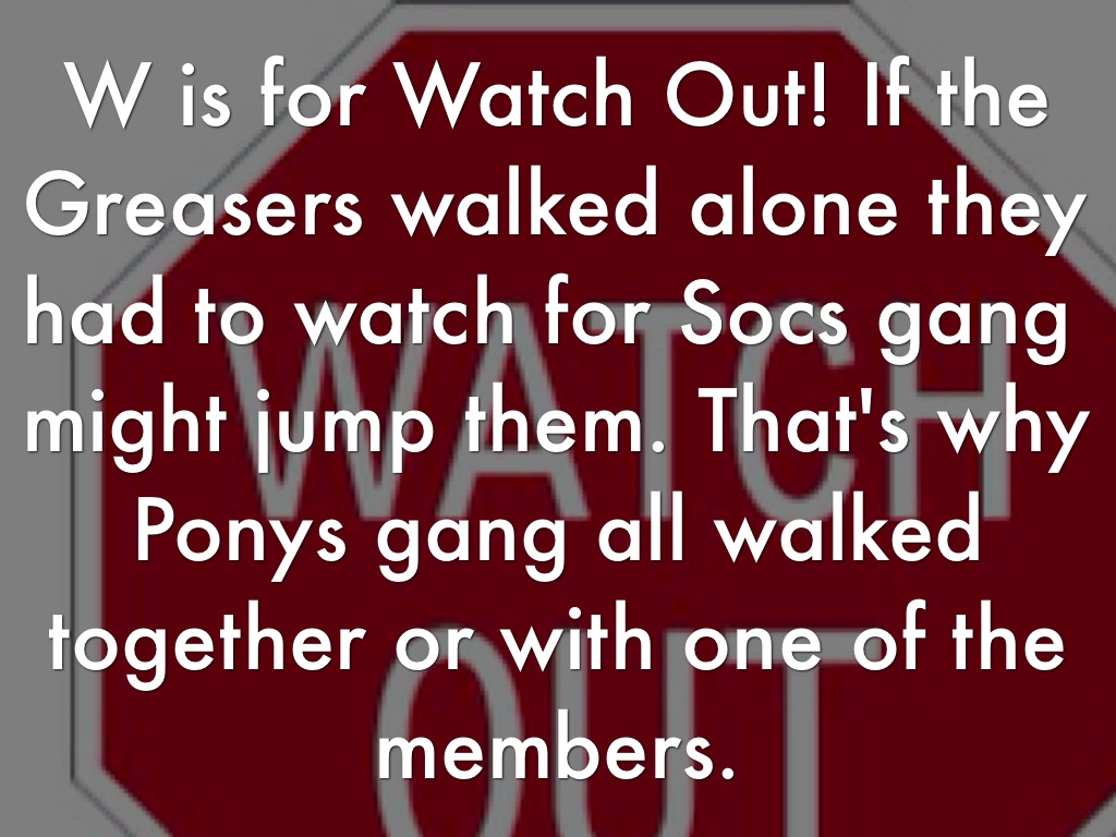 W is for Watch Out! If the Greasers walked alone they had to watch for Socs gang might jump them. That's why Ponys gang all walked together or with one of the members.