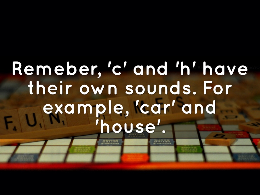 Remeber, 'c' and 'h' have their own sounds. For example, 'car' and 'house'.