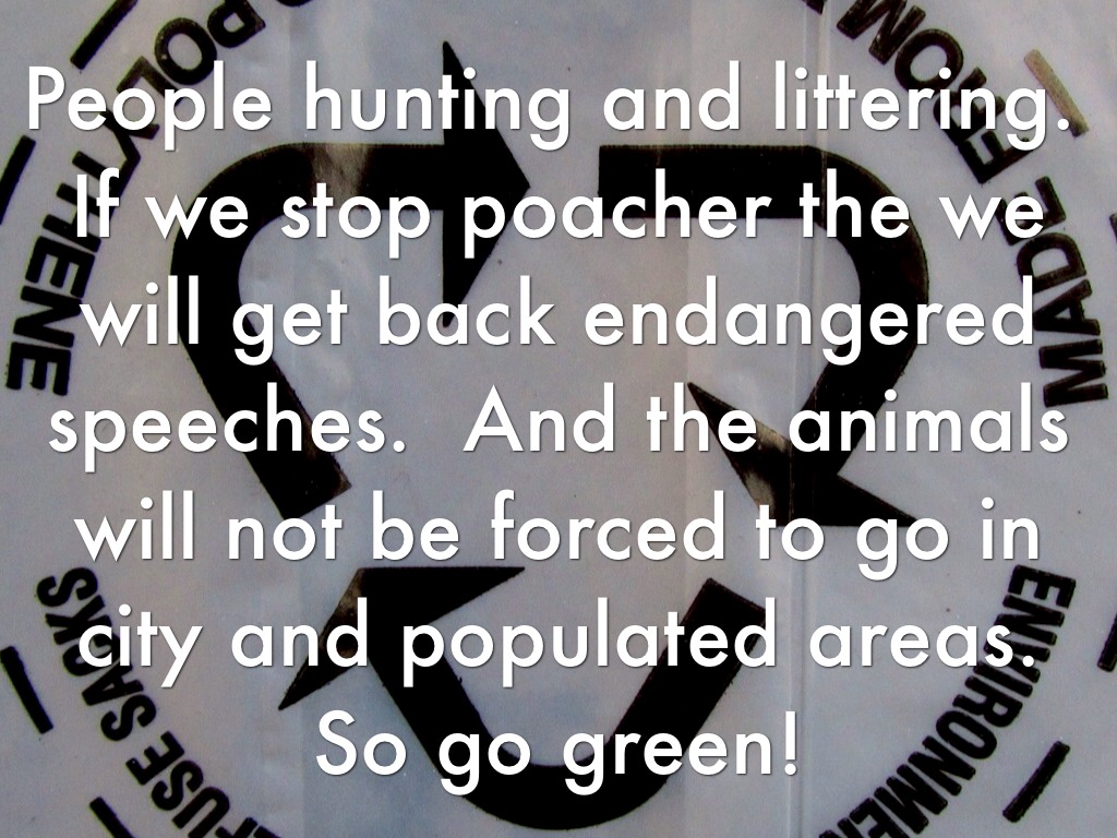 People hunting and littering. If we stop poacher the we will get back endangered speeches. And the animals will not be forced to go in city and populated areas. So go green!