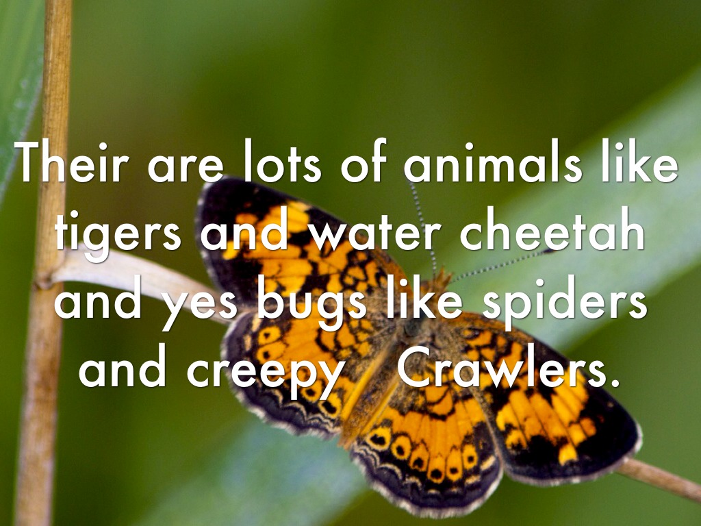 Their are lots of animals like tigers and water cheetah and yes bugs like spiders and creepy Crawlers.