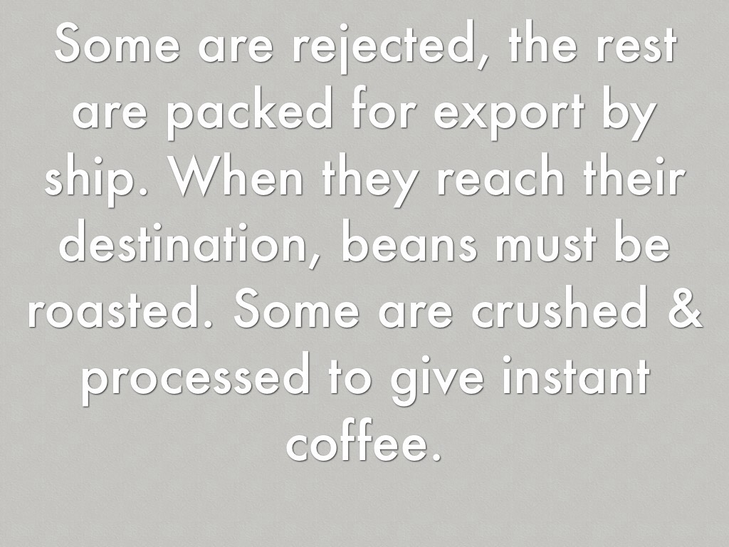 Some are rejected, the rest are packed for export by ship. When they reach their destination, beans must be roasted. Some are crushed & processed to give instant coffee.