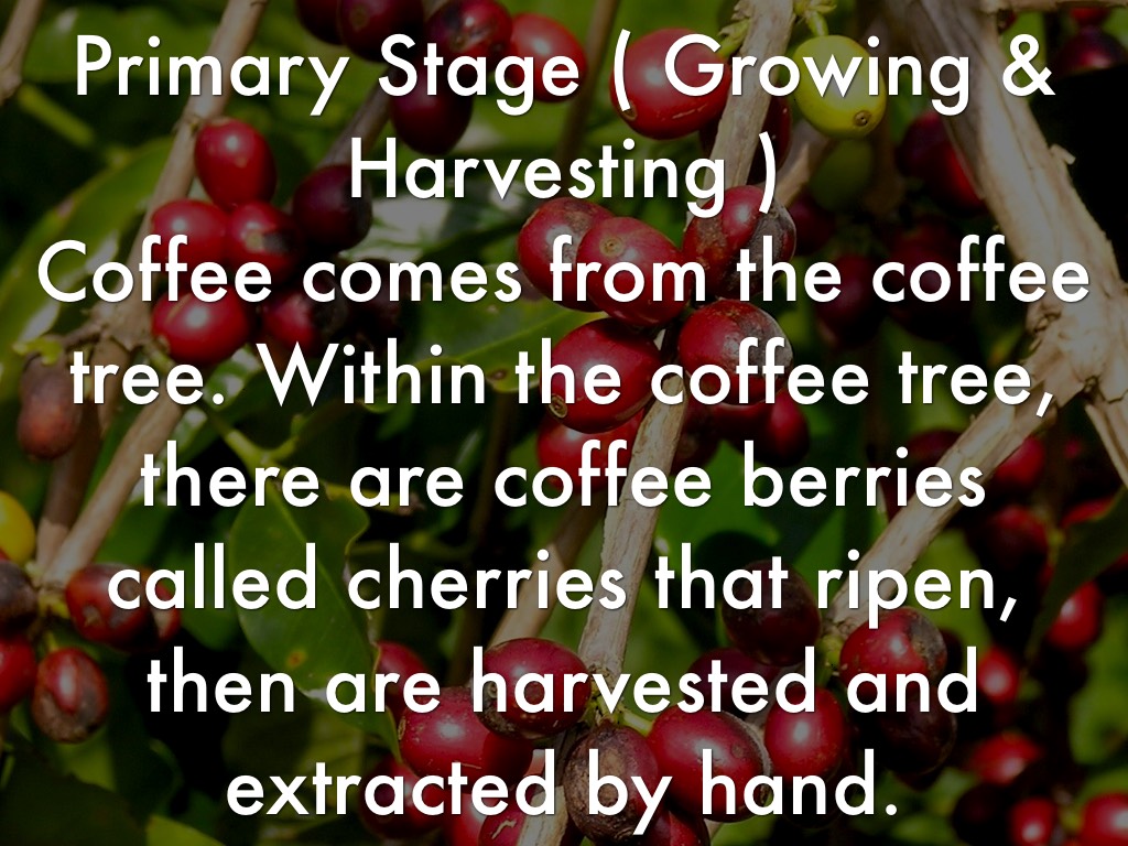 Primary Stage ( Growing & Harvesting ) Coffee comes from the coffee tree. Within the coffee tree, there are coffee berries called cherries that ripen, then are harvested and extracted by hand.