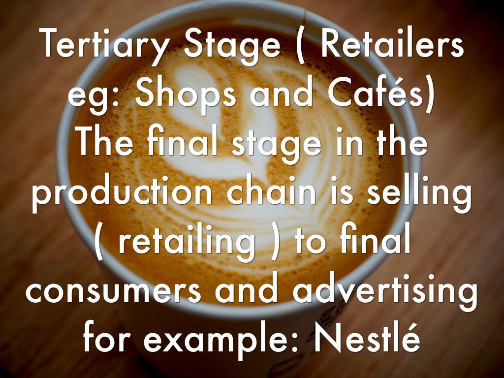 Tertiary Stage ( Retailers eg: Shops and Cafés) The final stage in the production chain is selling ( retailing ) to final consumers and advertising for example: Nestlé