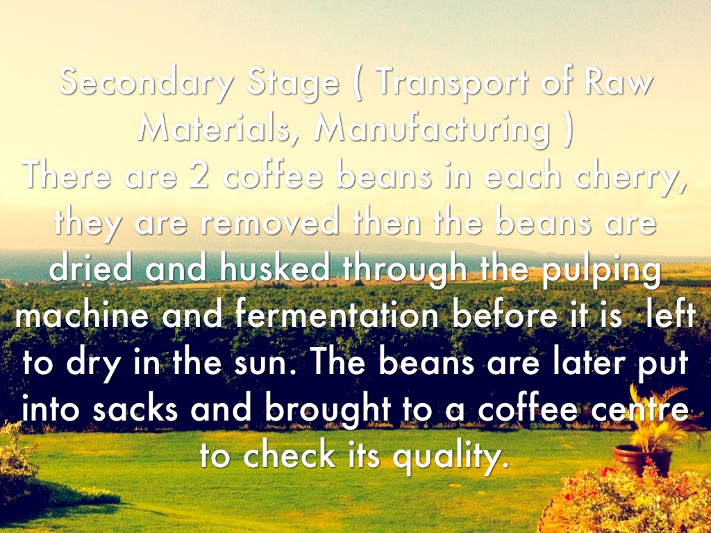 Secondary Stage ( Transport of Raw Materials, Manufacturing ) There are 2 coffee beans in each cherry, they are removed then the beans are dried and husked through the pulping machine and fermentation before it is left to dry in the sun. The beans are later put into sacks and brought to a coffee centre to check its quality.
