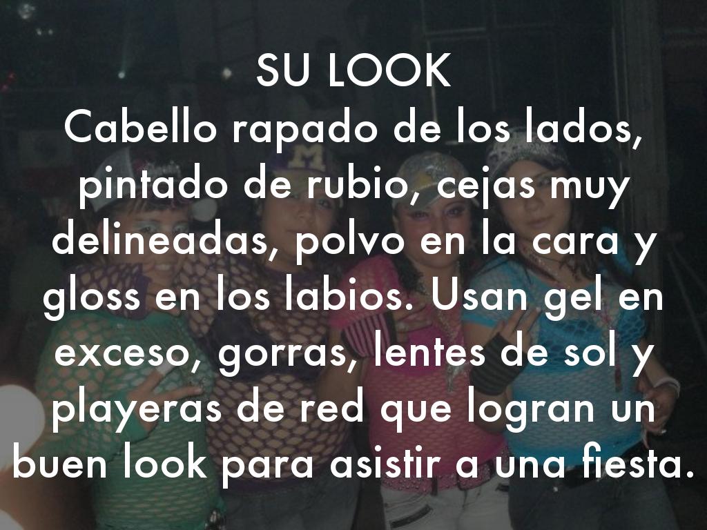 Cabello rapado de los lados, pintado de rubio, cejas muy delineadas, polvo en la cara y gloss en los labios. Usan gel en exceso, gorras, lentes de sol y playeras de red que logran un buen look para asistir a una fiesta.