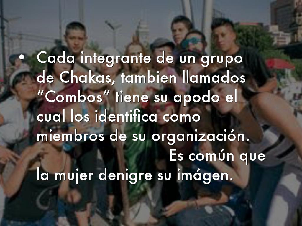 - Cada integrante de un grupo de Chakas, tambien llamados “Combos” tiene su apodo el cual los identifica como miembros de su organización. Es común que la mujer denigre su imágen.