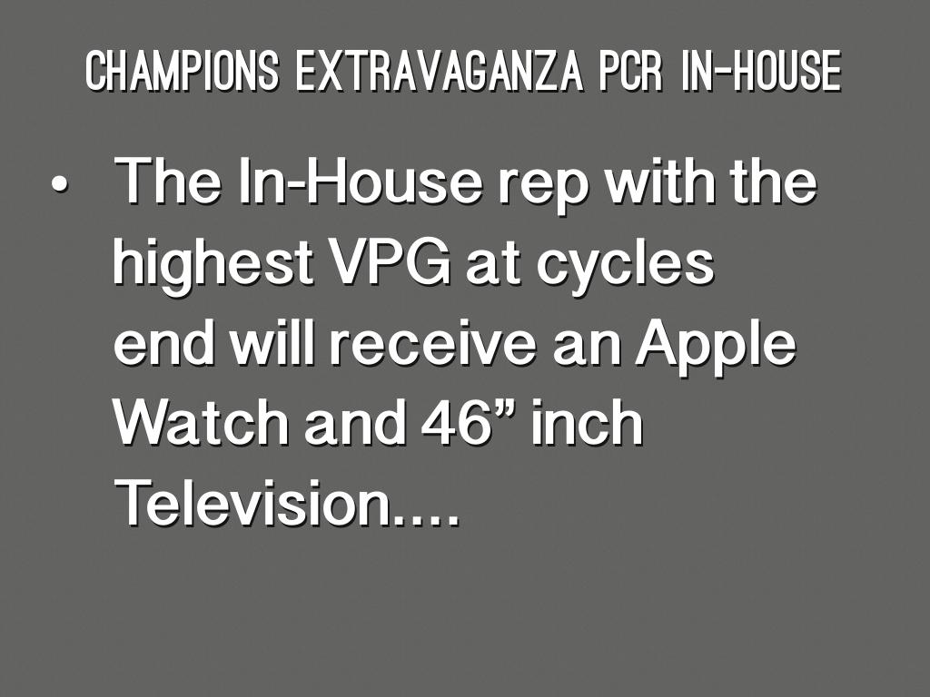 - The In-House rep with the highest VPG at cycles end will receive an Apple Watch and 46” inch Television....