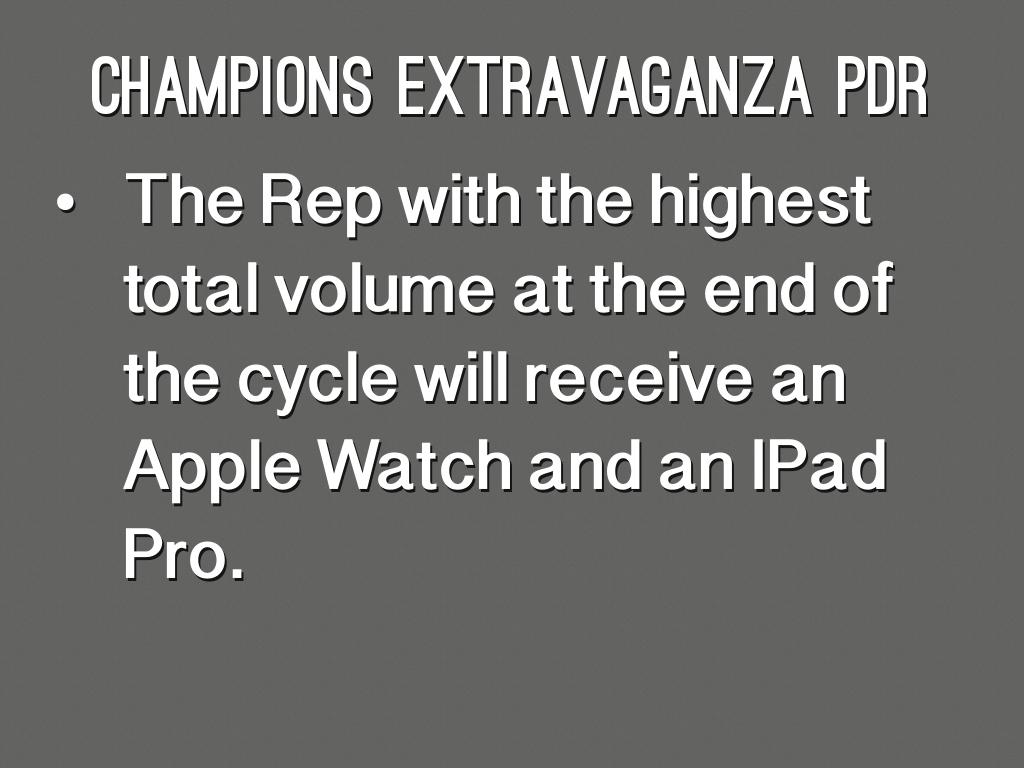 - The Rep with the highest total volume at the end of the cycle will receive an Apple Watch and an IPad Pro.