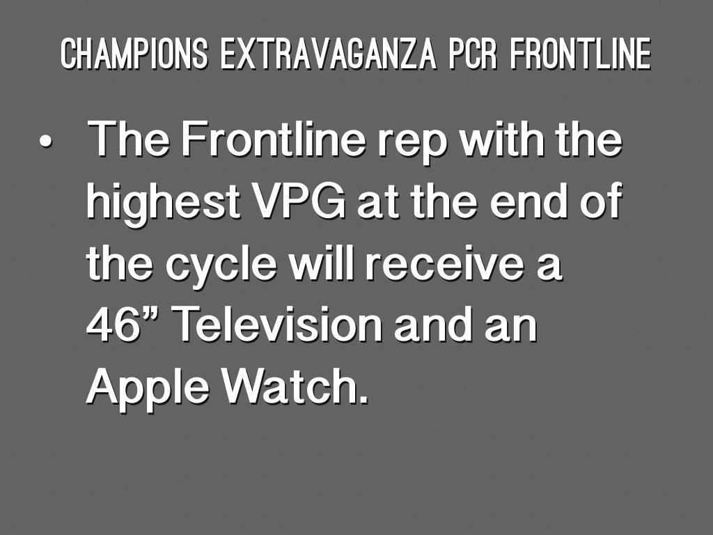 - The Frontline rep with the highest VPG at the end of the cycle will receive a 46” Television and an Apple Watch.