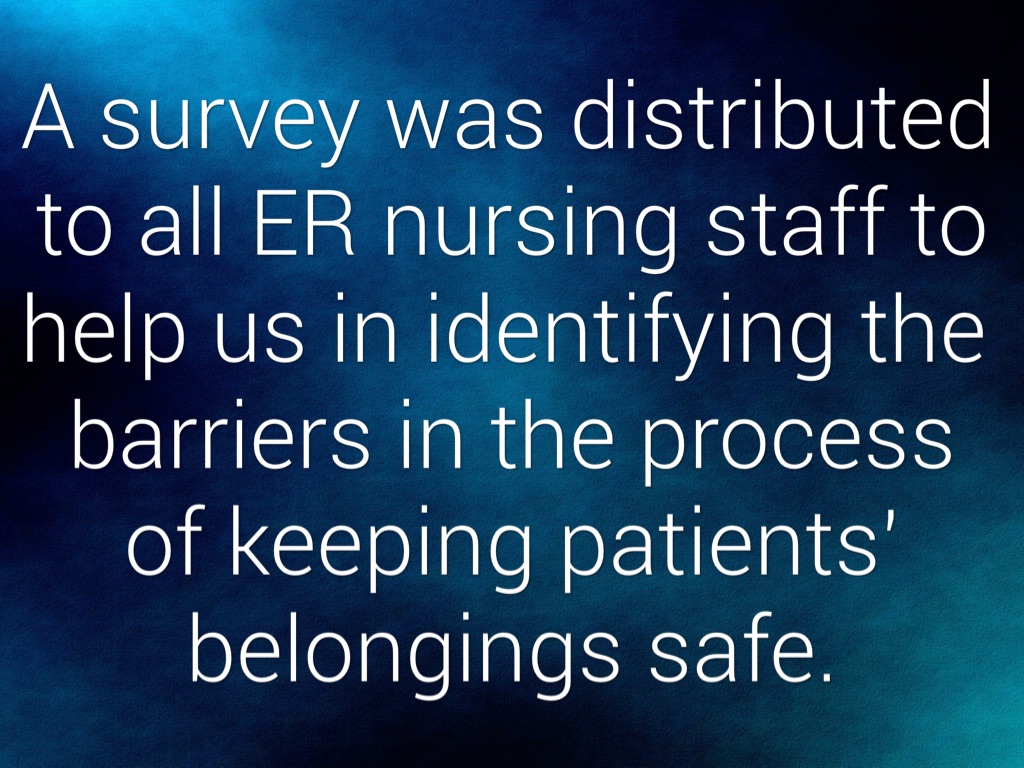A survey was distributed to all ER nursing staff to help us in identifying the barriers in the process of keeping patients' belongings safe.