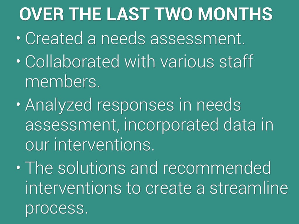 - Analyzed responses in needs assessment, incorporated data in our interventions.