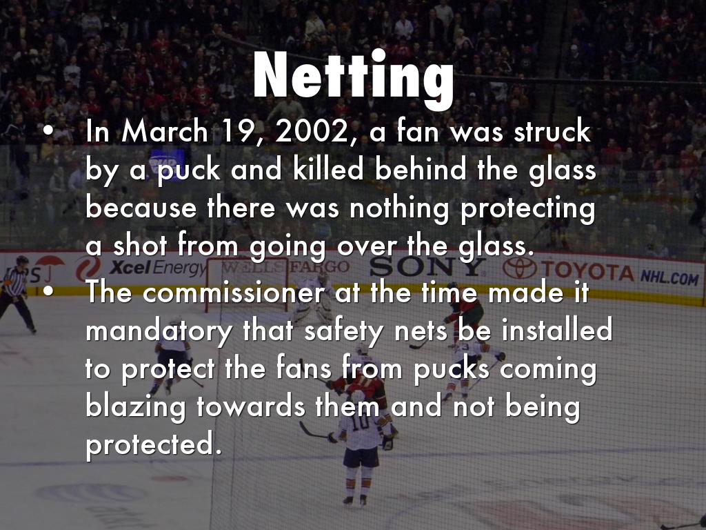 The commissioner at the time made it mandatory that safety nets be installed to protect the fans from pucks coming blazing towards them and not being protected.