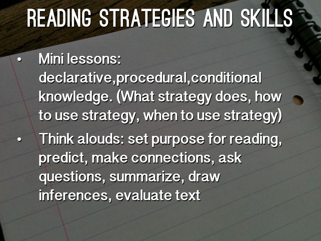 Think alouds: set purpose for reading, predict, make connections, ask questions, summarize, draw inferences, evaluate text