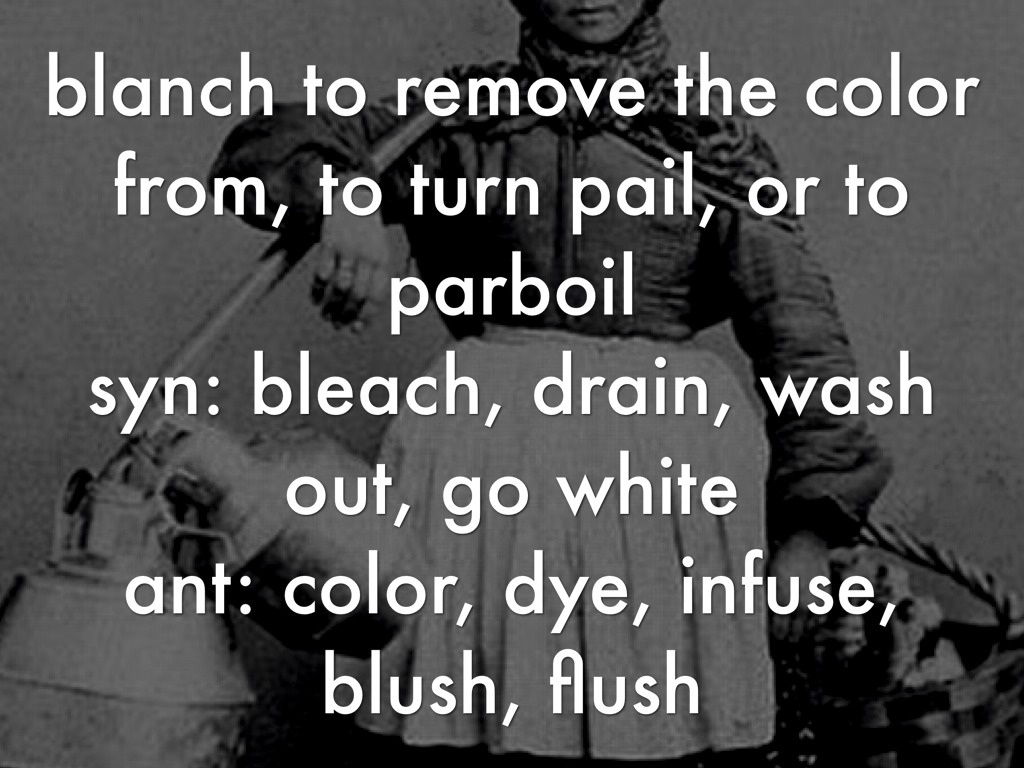 blanch to remove the color from, to turn pail, or to parboil