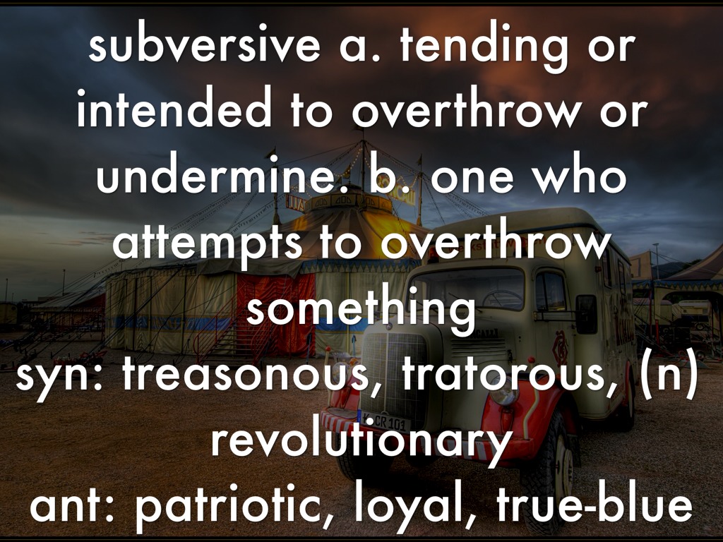 subversive a. tending or intended to overthrow or undermine. b. one who attempts to overthrow something
