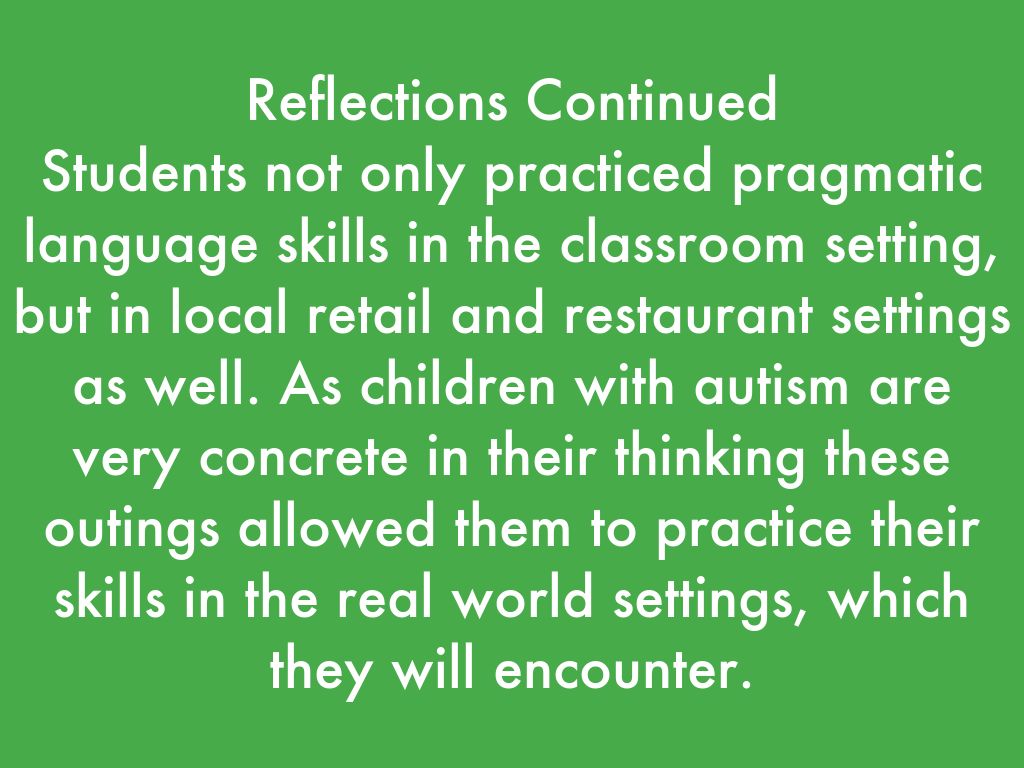 Students not only practiced pragmatic language skills in the classroom setting, but in local retail and restaurant settings as well. As children with autism are very concrete in their thinking these outings allowed them to practice their skills in the real world settings, which they will encounter.