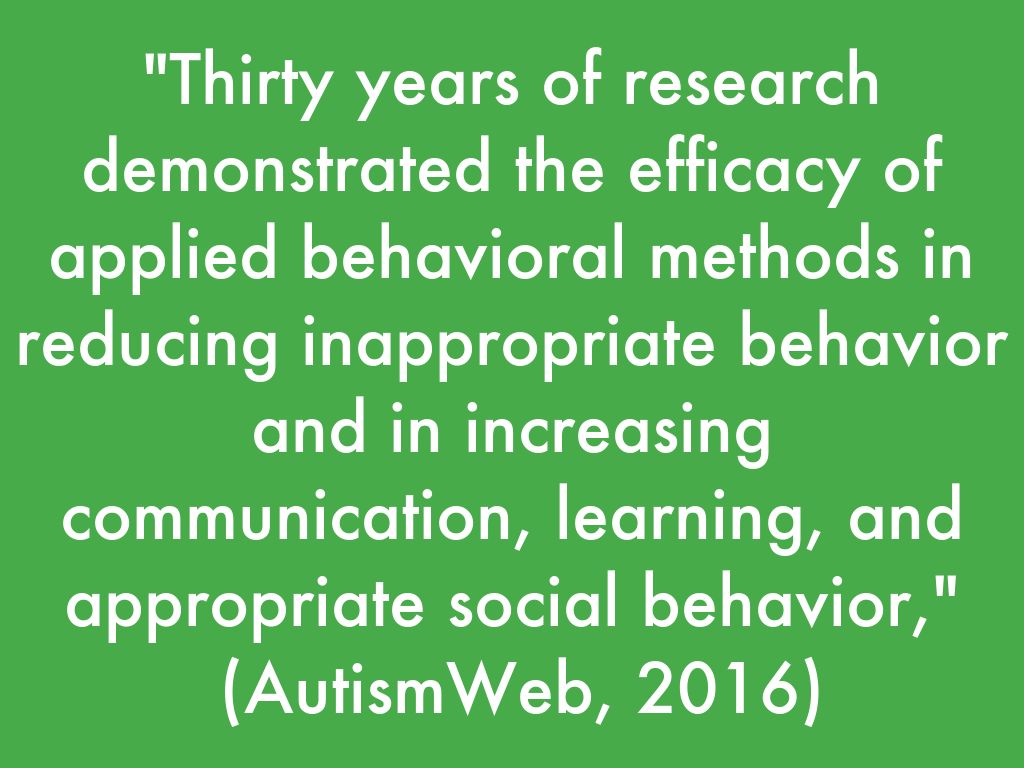 "Thirty years of research demonstrated the efficacy of applied behavioral methods in reducing inappropriate behavior and in increasing communication, learning, and appropriate social behavior," (AutismWeb, 2016)