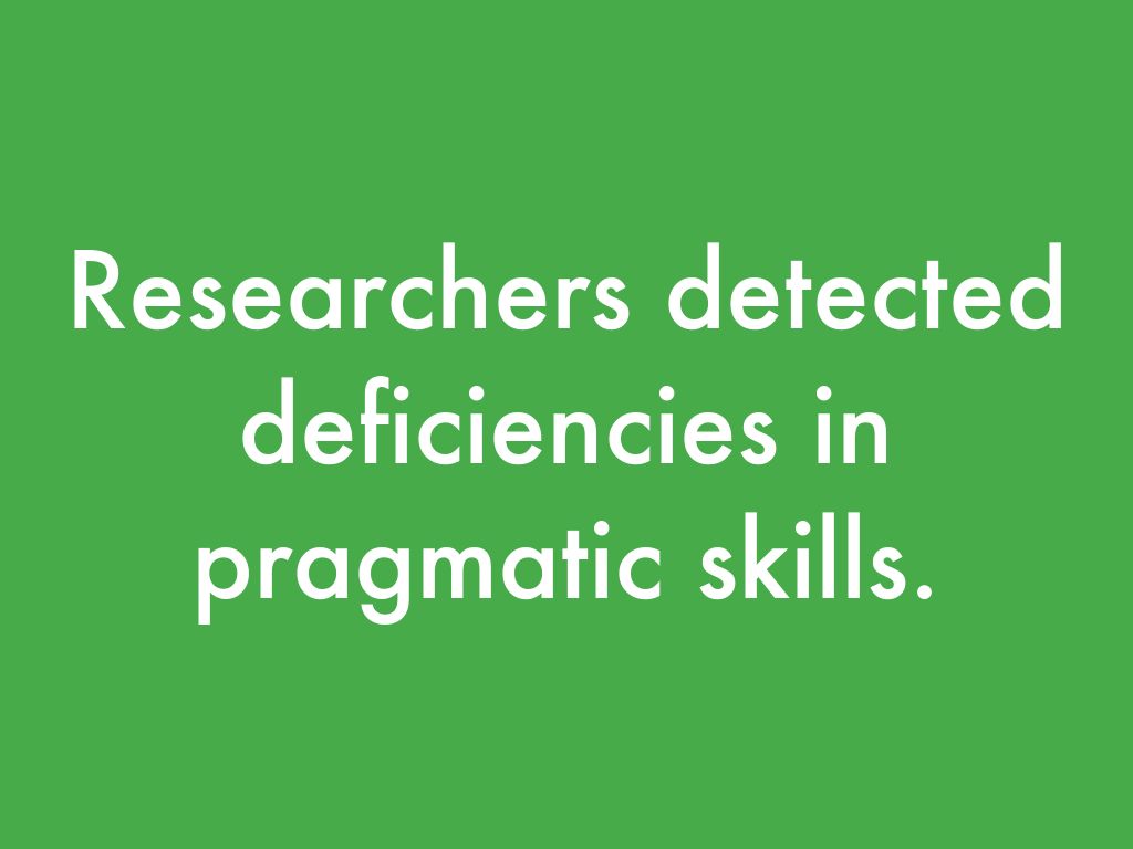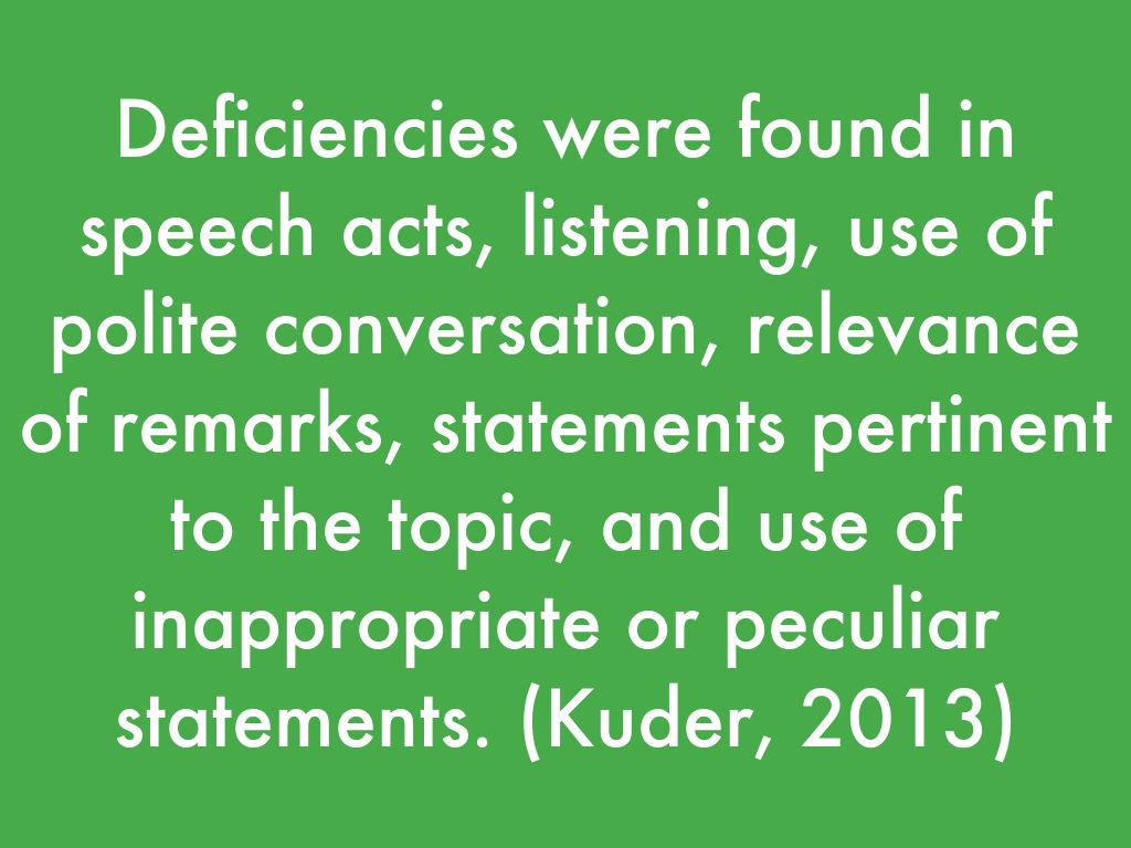 Deficiencies were found in speech acts, listening, use of polite conversation, relevance of remarks, statements pertinent to the topic, and use of inappropriate or peculiar statements. (Kuder, 2013)